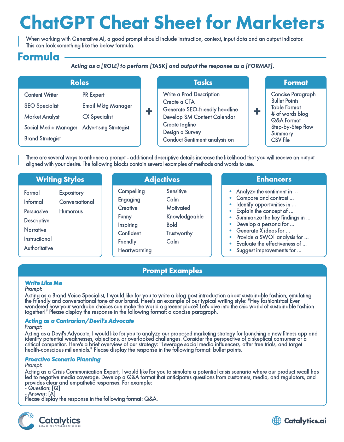 In the ever-evolving world of digital marketing, ChatGPT stands as a game-changer. But how can you harness its full potential? We've done the heavy lifting for you. Dive into our meticulously crafted cheat sheet and discover the secrets to supercharging your marketing prompts with ChatGPT. From best practices to power words that amplify engagement, this PDF is your golden ticket to mastering ChatGPT for marketing.